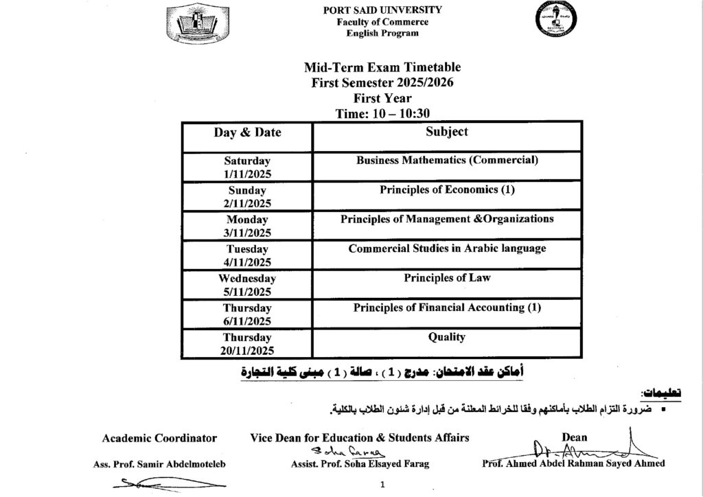 جدول امتحانات اعمال السنة الفرقة الاولى ( شعبة اللغة الانجليزية )للفصل الدراسى الاول من العام الجامعى 2026/2025بواسطة Commerce Author / أكتوبر 21, 2025