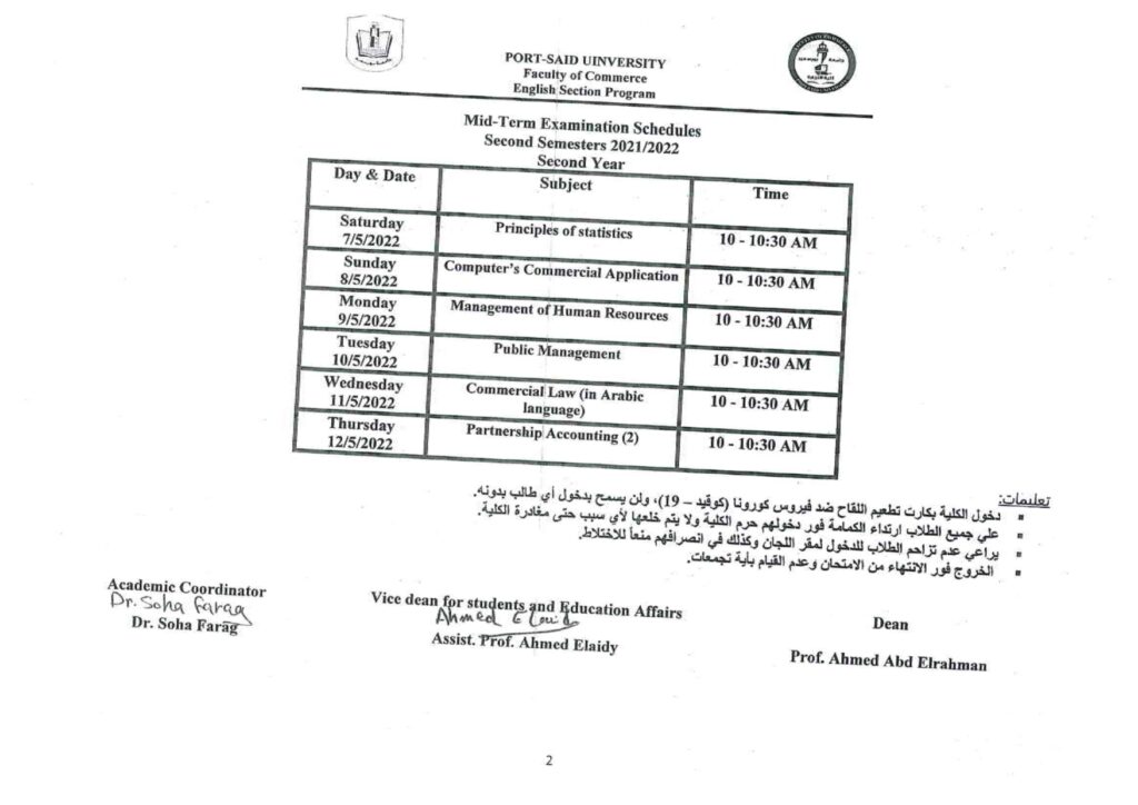 جدول امتحانات اعمال السنة الفرقة الثانية شعبة اللغة الانجليزية للفصل الدر اسى الثانى من العام الجامعى 2021/2022بواسطة Commerce Author / أبريل 26, 2022