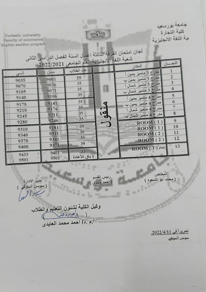 لجان وارقام الجلوس الفرقة الثالثة شعبة اللغة الانجليزية