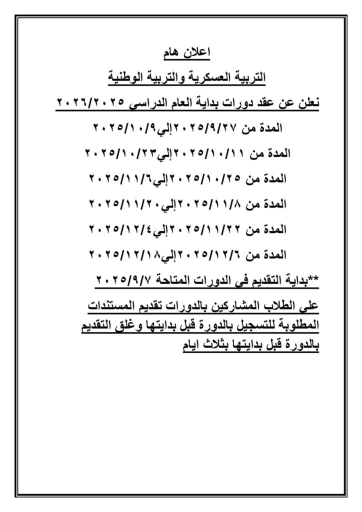 اعلان دورات التربية الوطنية( بنات )الفرقة الاولى انتساب خلال شهر ( اكتوبر – نوفمبر – ديسمبر2025بواسطة Commerce Author / أكتوبر 12, 2025 كشوف اسماء الطالبات