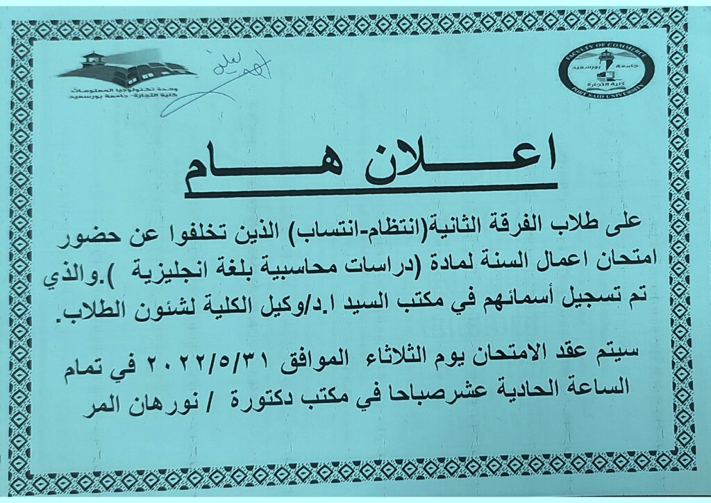 اعلان هام لطلاب الفرقة الثانية انتظام- انتساب الذين تخلفوا عن امتحان اعمال السنة ( مادة دراسات محاسبية بلغة انجليزية )بواسطة Commerce Author / مايو 25, 2022
