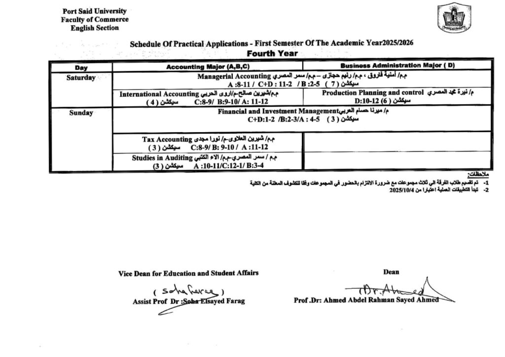 جدول التطبيقات العملية للفرقة الرابعة شعبة اللغة الانجليزية للفصل الدراسى الاول من العام الجامعى 2026/2025
