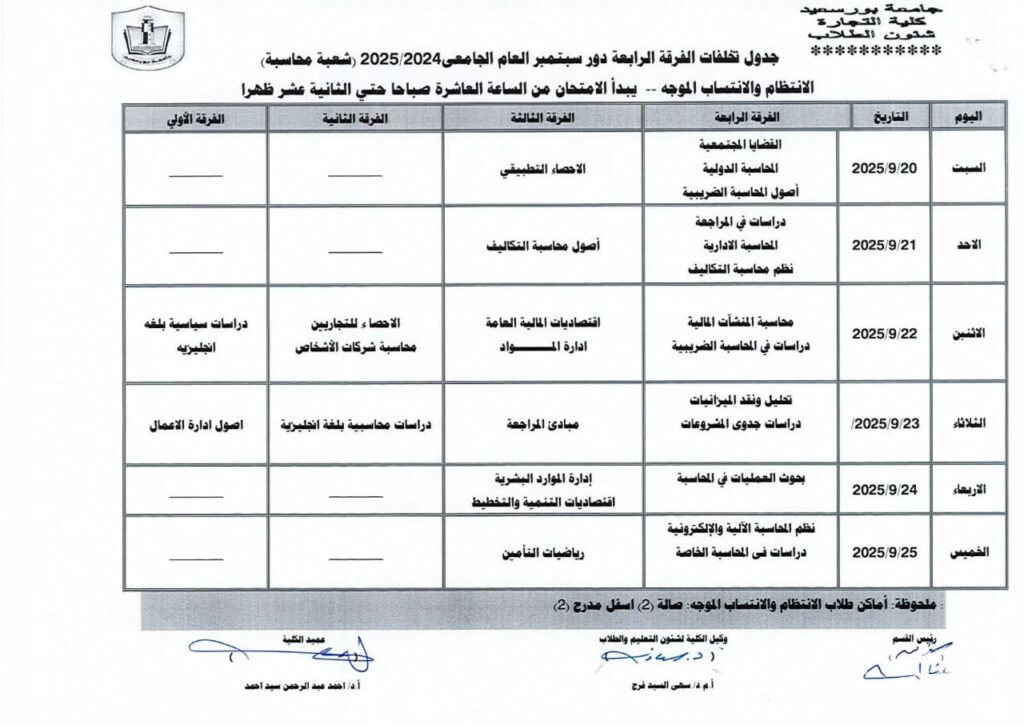 جدول امتحانات تخلفات الفرقة الرابعة انتظام – انتساب (دور سبتمبر )شعبة محاسبة للعام الجامعى 2025/2024