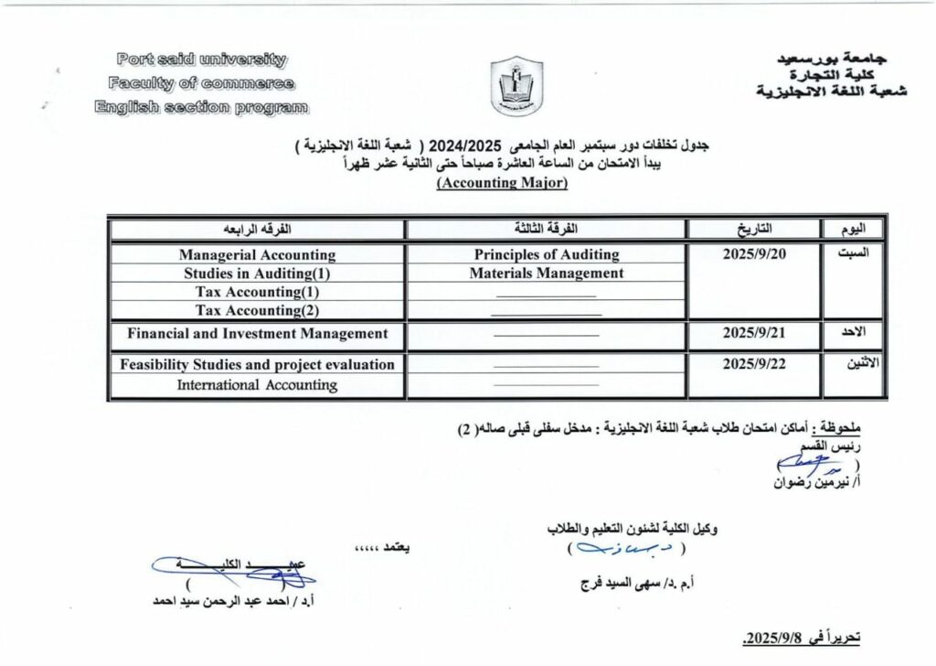 جدول امتحانات تخلفات الفرقة الرابعة شعبة اللغة الانجليزية (دور سبتمبر )شعبة محاسبة للعام الجامعى 2025/2024بواسطة Commerce Author / سبتمبر 9, 2025