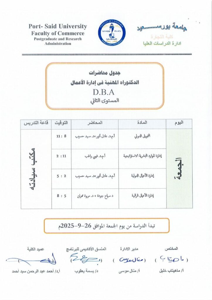 جدول محاضرات الدكتوراه المهنية فى ادارة الاعمال D.B.A (المستوى الثانى )للعام الجامعى 2026/2025بواسطة Commerce Author / سبتمبر 17, 2025