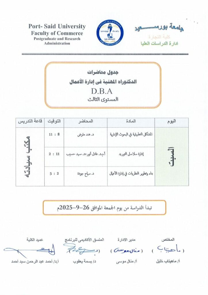جدول محاضرات الدكتوراه المهنية فى ادارة الاعمال D.B.A (المستوى الثالث )للعام الجامعى 2026/2025بواسطة Commerce Author / سبتمبر 17, 2025