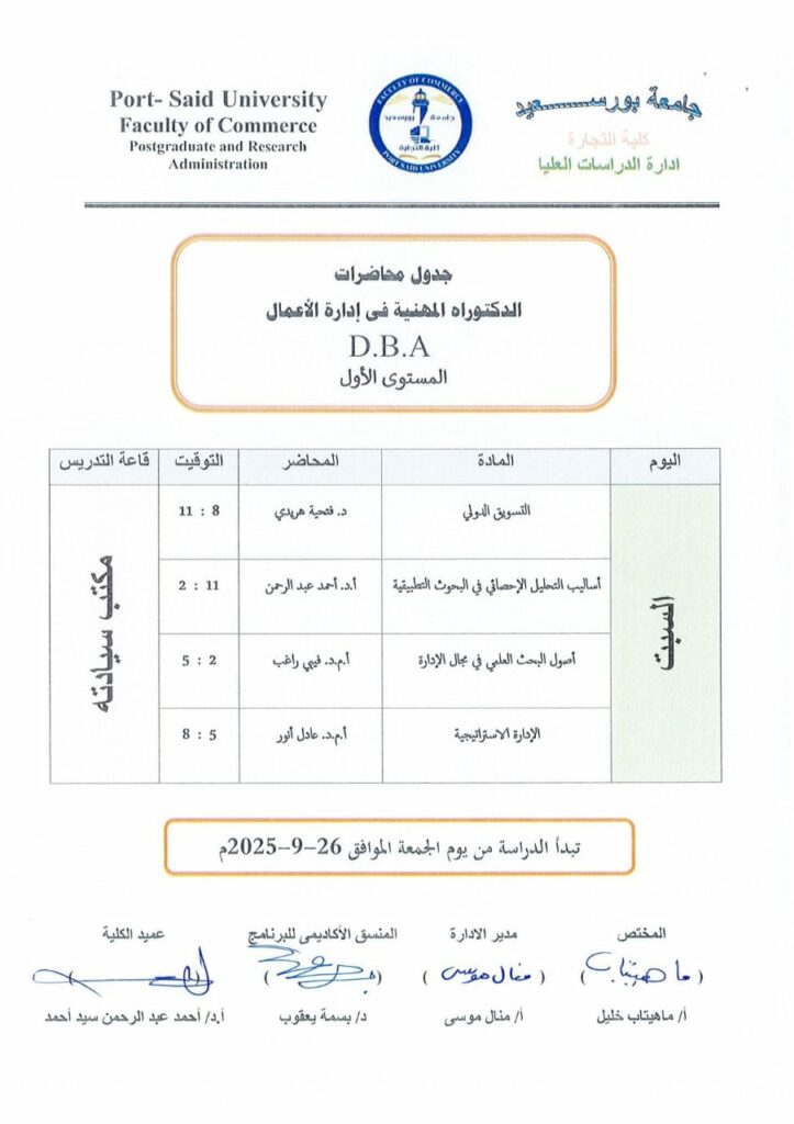 جدول محاضرات الدكتوراه المهنية فى ادارة الاعمال D.B.A (المستوى الاول)للعام الجامعى 2026/2025بواسطة Commerce Author / سبتمبر 17, 2025