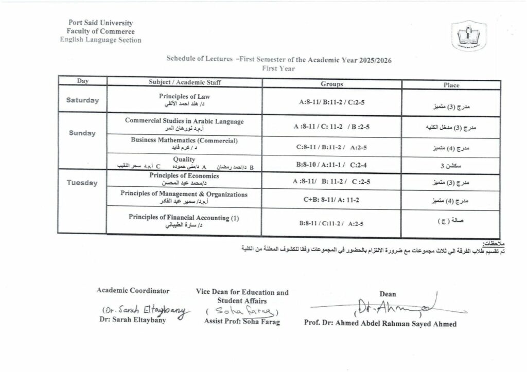 جدول محاضرات الفرقةالاولى شعبة اللغة الانجليزية للفصل الدراسى الاول من العام الجامعى 2026/2025بواسطة Commerce Author / سبتمبر 14, 2025