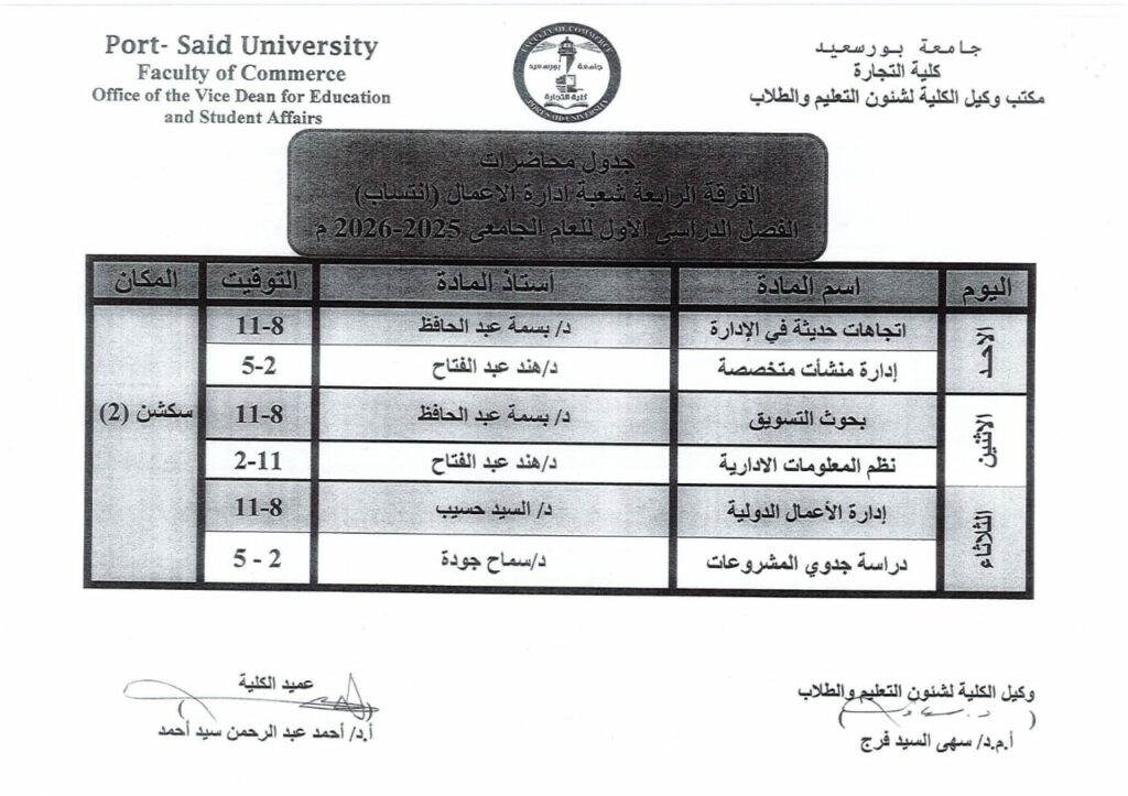 جدول محاضرات الفرقةالرابعة شعبة ادارة اعمال انتساب للفصل الدراسى الاول من العام الجامعى 2026/2025بواسطة Commerce Author / سبتمبر 14, 2025