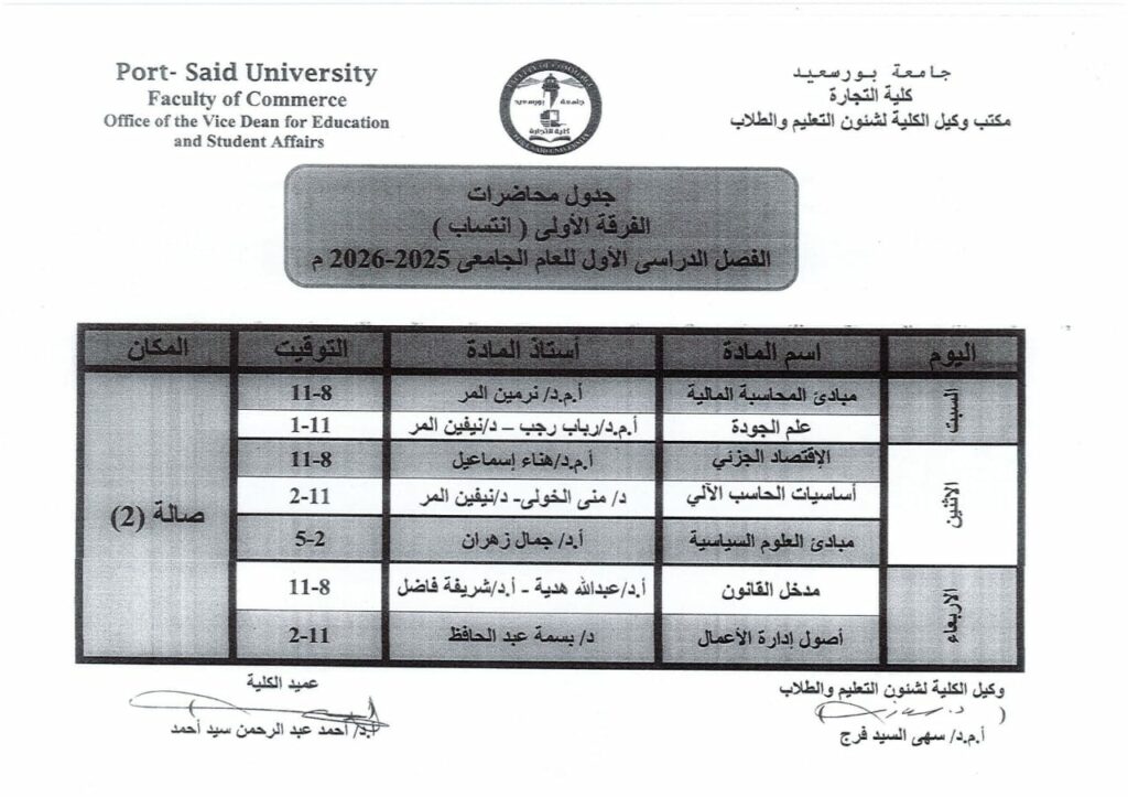 جدول محاضرات الفرقة الاولى انتساب للفصل الدراسى الاول من العام الجامعى 2026/2025بواسطة Commerce Author / سبتمبر 14, 2025