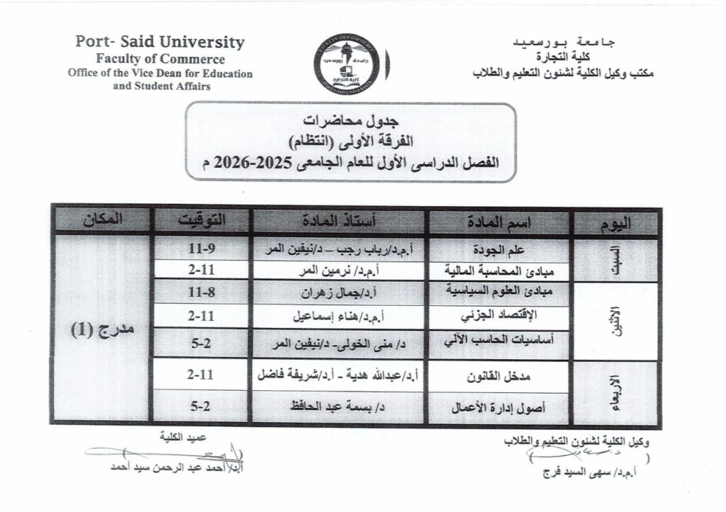 جدول محاضرات الفرقة الاولى انتظام للفصل الدراسى الاول من العام الجامعى 2026/2025بواسطة Commerce Author / سبتمبر 14, 2025