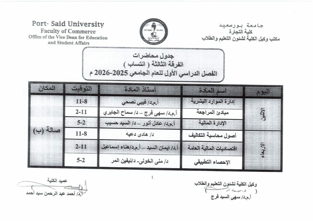 جدول محاضرات الفرقة الثالثة انتساب للفصل الدراسى الاول من العام الجامعى 2026/2025بواسطة Commerce Author / سبتمبر 14, 2025