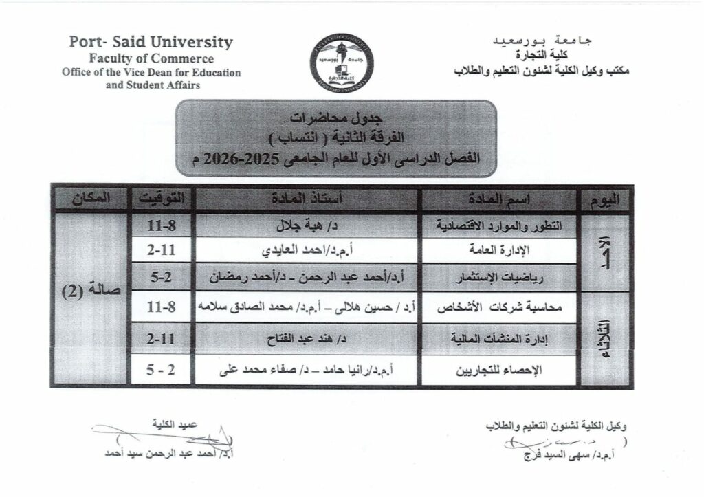 جدول محاضرات الفرقة الثانية انتساب للفصل الدراسى الاول من العام الجامعى 2026/2025بواسطة Commerce Author / سبتمبر 14, 2025