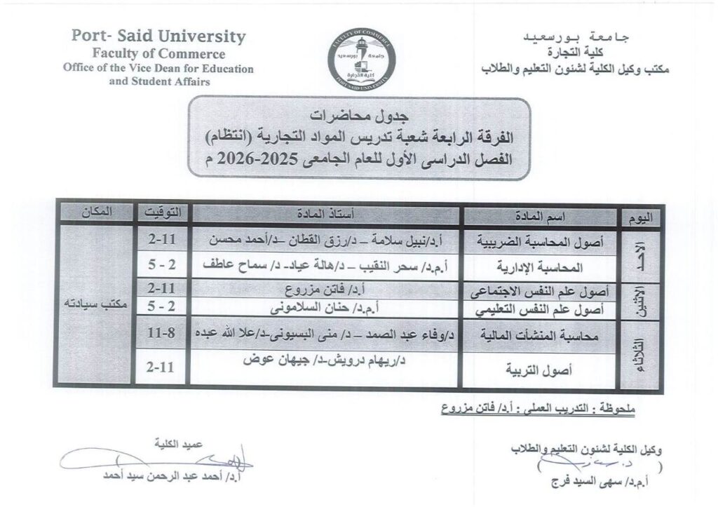 جدول محاضرات الفرقة الرابعة انتظام شعبة تدريس المواد التجارية للفصل الدراسى الاول من العام الجامعى 2026/2025بواسطة Commerce Author / سبتمبر 24, 2025