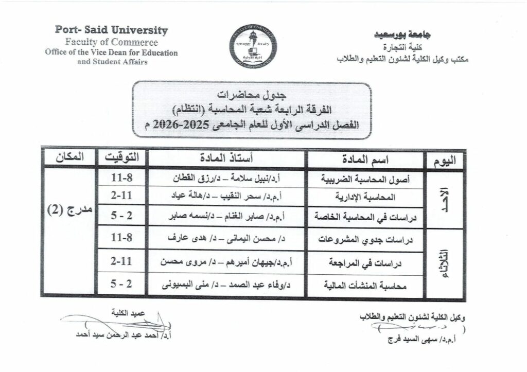 جدول محاضرات الفرقة الرابعة محاسبة انتظام للفصل الدراسى الاول من العام الجامعى 2026/2025بواسطة Commerce Author / سبتمبر 14, 2025