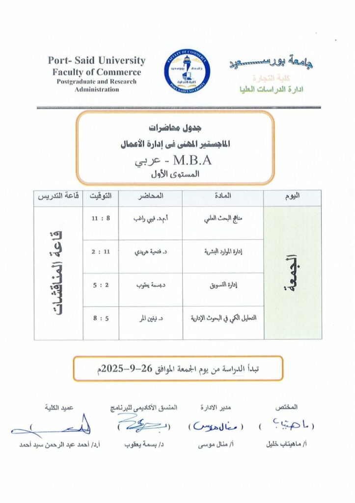 جدول محاضرات الماجستير المهنى فى ادارة الاعمال M.B.A (عربى ) المستوى الاول للعام الجامعى 2026/2025بواسطة Commerce Author / سبتمبر 17, 2025