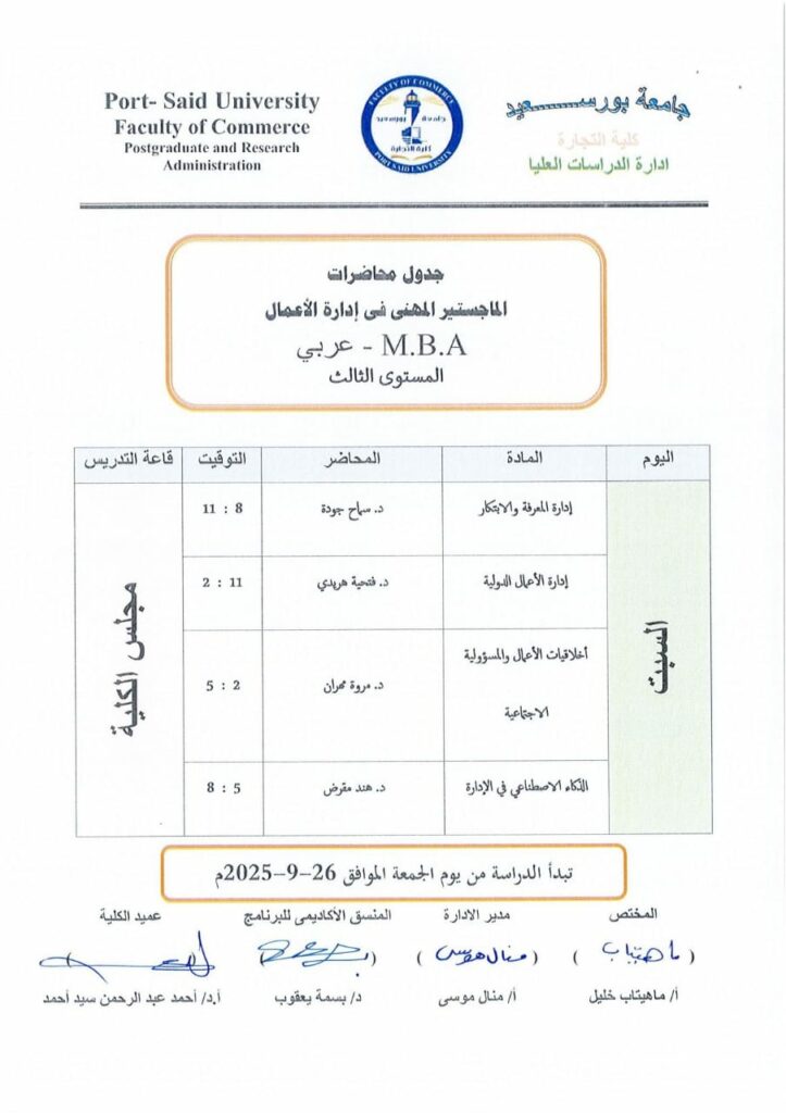 جدول محاضرات الماجستير المهنى فى ادارة الاعمال M.B.A (المستوى الثالث)عربى للعام الجامعى 2026/2025بواسطة Commerce Author / سبتمبر 17, 2025