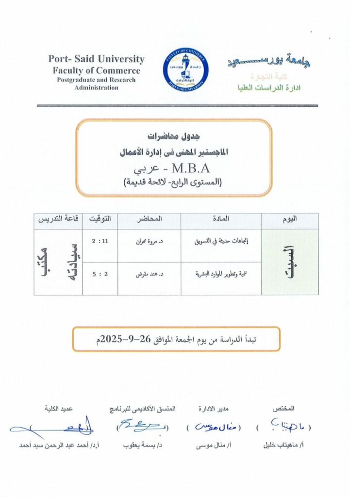 جدول محاضرات الماجستير المهنى فى ادارة الاعمال M.B.A (المستوى الرابع )عربى لائحة قديمة للعام الجامعى 2026/2025