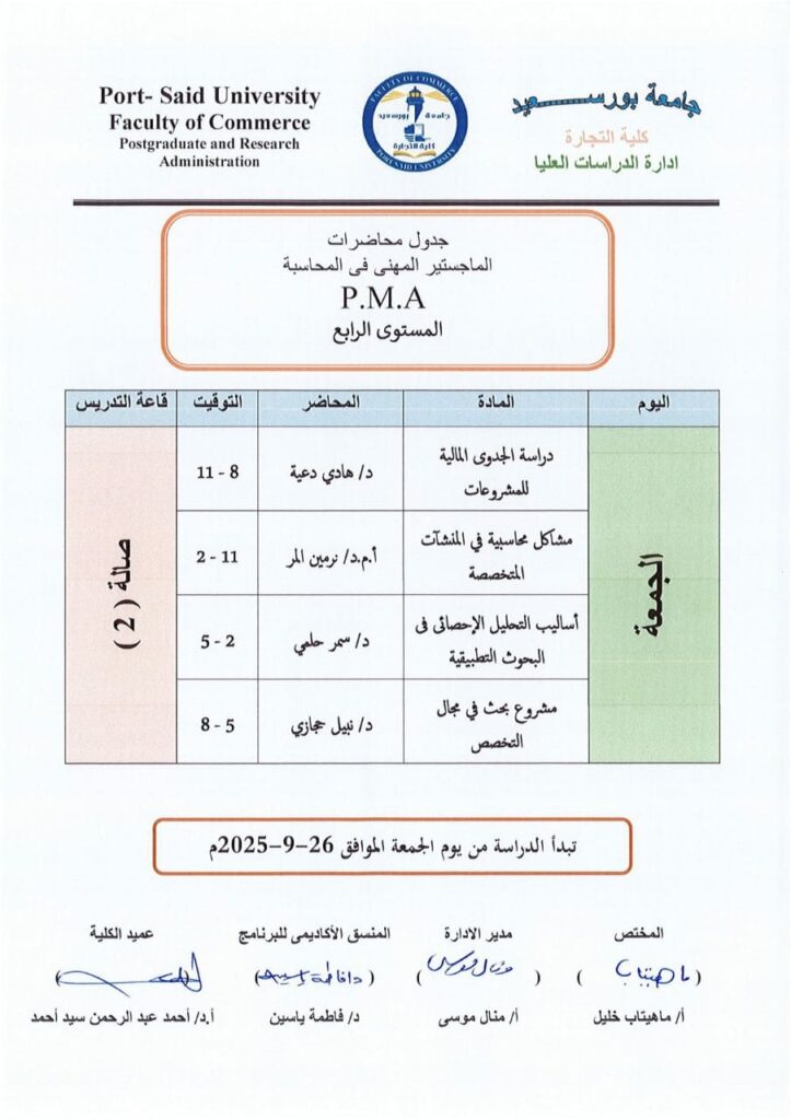 جدول محاضرات الماجستير المهنى M.B.Aفى المحاسبة (المستوى الرابع )للعام الجامعى 2026/2025بواسطة Commerce Author / سبتمبر 17, 2025