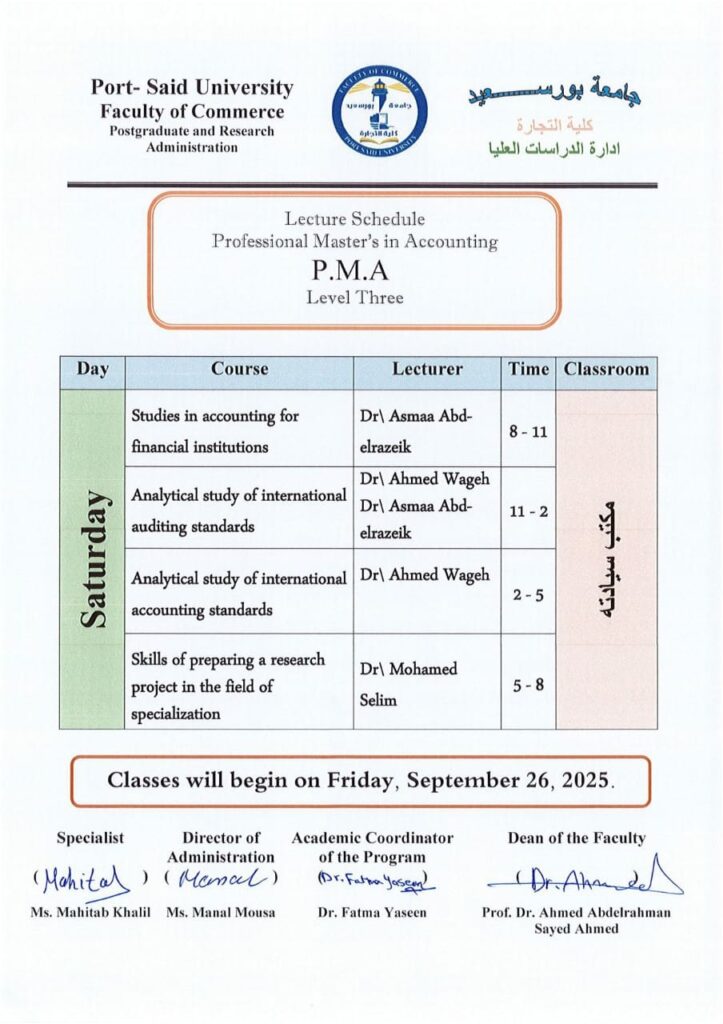 جدول محاضرات الماجستير المهنى(M.B.A) Professional Master’s in Accountingللعام الجامعى 2026/2025 (LEVEL3)