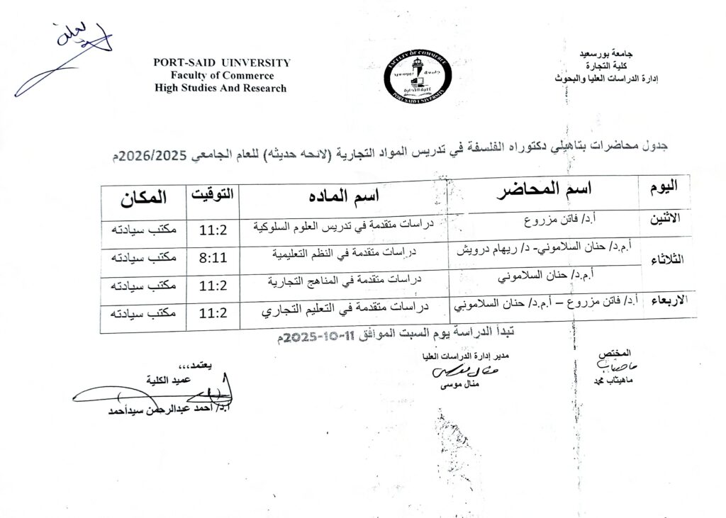 جدول محاضرات تأهيلى دكتوراه الفلسفة فى تدريس المواد التجارية لائحة حديثة للعام الجامعى 2026/2025بواسطة Commerce Author / نوفمبر 2, 2025