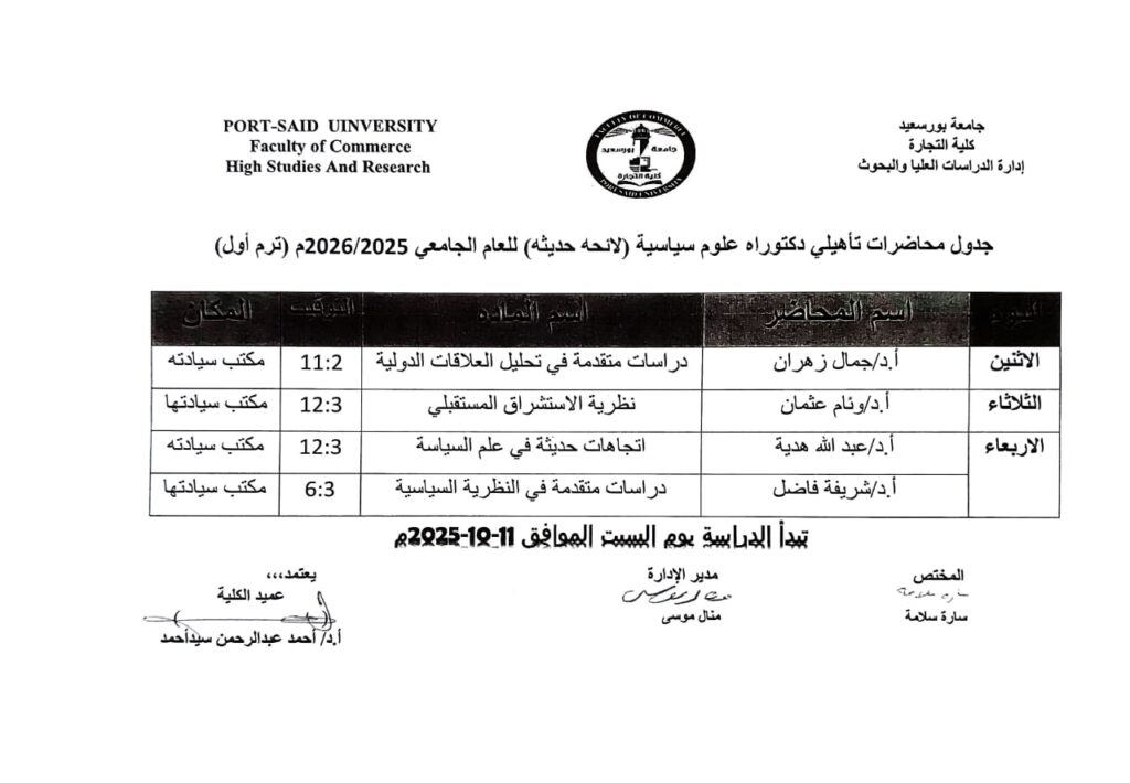 جدول محاضرات تاهيلى علوم سياسية لائحة حديثة للعام الجامعى 2026/2025( ترم اول )بواسطة Commerce Author / أكتوبر 8, 2025