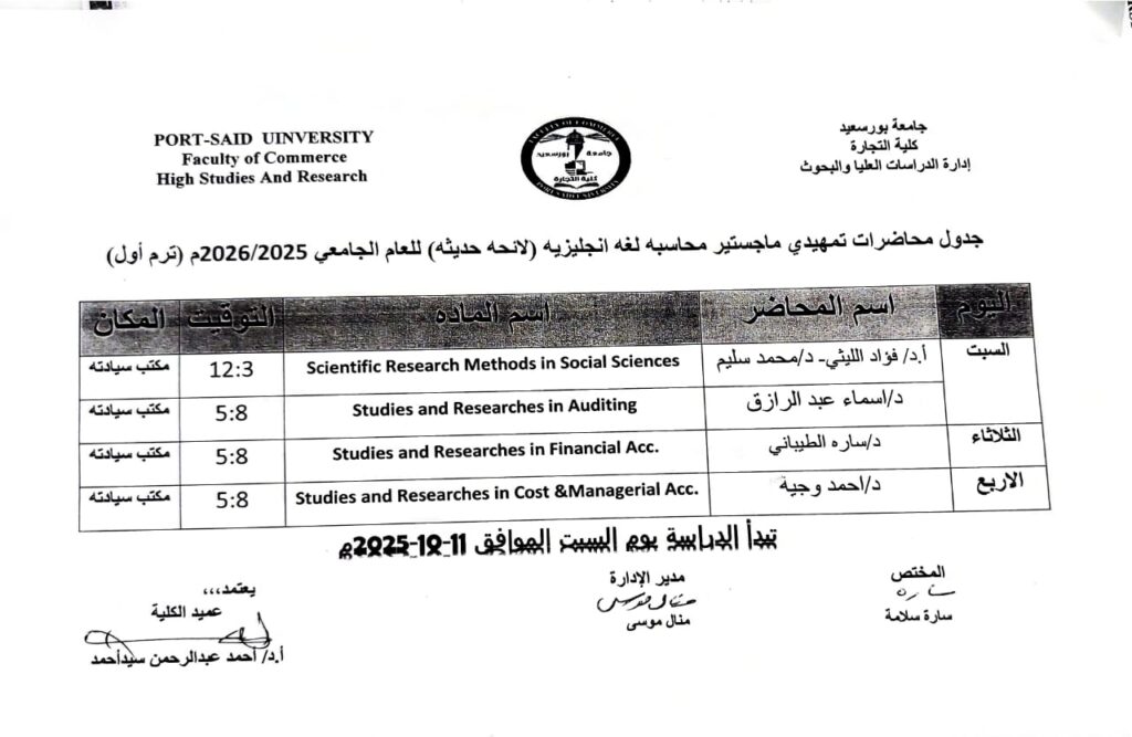 جدول محاضرات تمهيدى ماجستيرمحاسبة لغة انجليزيةلائحة حديثة للعام الجامعى 2026/2025بواسطة Commerce Author / أكتوبر 8, 2025