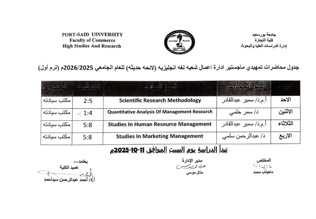 جدول محاضرات تمهيدى ماجستير ادارة اعمال شعبة اللغة الانجليزية لائحة حديثة للعام الجامعى 2026/2025( ترم اول )بواسطة Commerce Author / أكتوبر 8, 2025