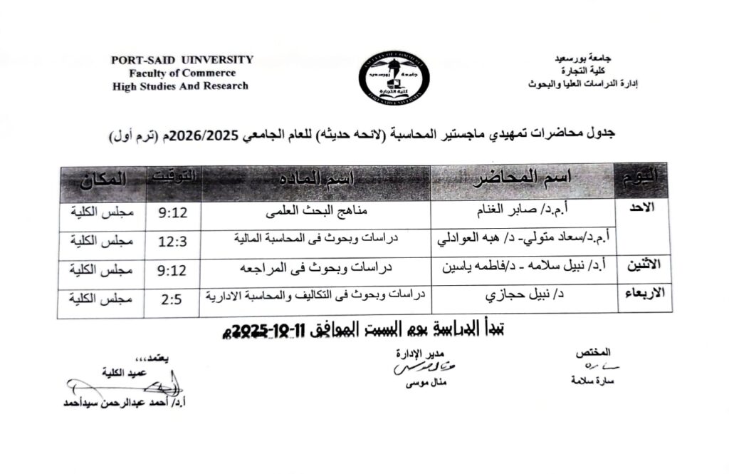 جدول محاضرات تمهيدى ماجستير المحاسبة لائحة حديثة للعام الجامعى 2026/2025( ترم اول )