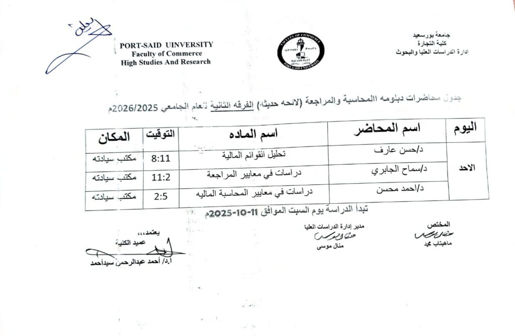 جدول محاضرات دبلومة المحاسبة والمراجعة لائحة حديثة الفرقة الثانية للعام الجامعى 2026/2025بواسطة Commerce Author / نوفمبر 2, 2025
