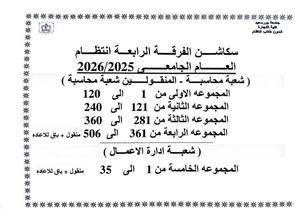 مجموعات وكشوف سكاشن الفرقة الرابعة انتظام للفصل الدراسى الاول من العام الجامعى 2026/2025بواسطة Commerce Author / أكتوبر 3, 2025 كشوف مجموعات سكاشن الفرقة الرابعة انتظام