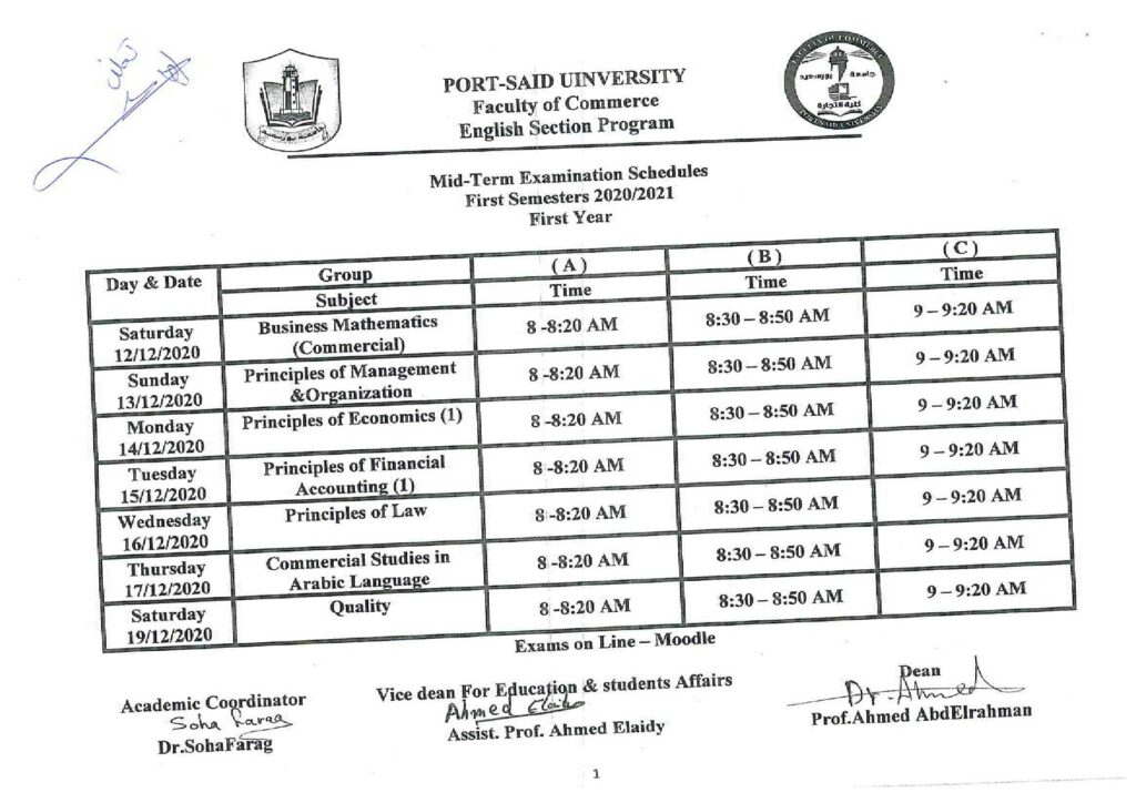 جدول اعمال السنة الفرقة الاولى شعبة اللغة ( منتصف الفصل الدراسى الاول من العام الجامعى 2020/2021بواسطة Commerce Author / ديسمبر 2, 2020