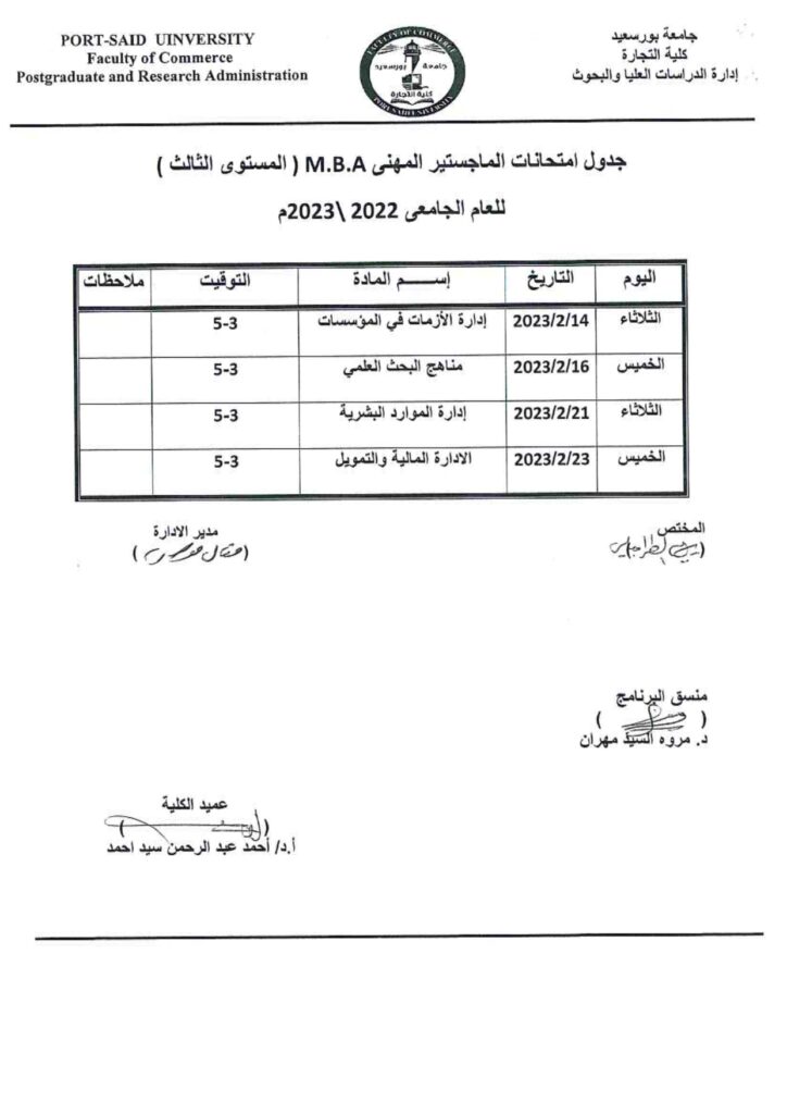 جدول امتحانات الماجستير المهنى M.B.A( المستوى الثالث)