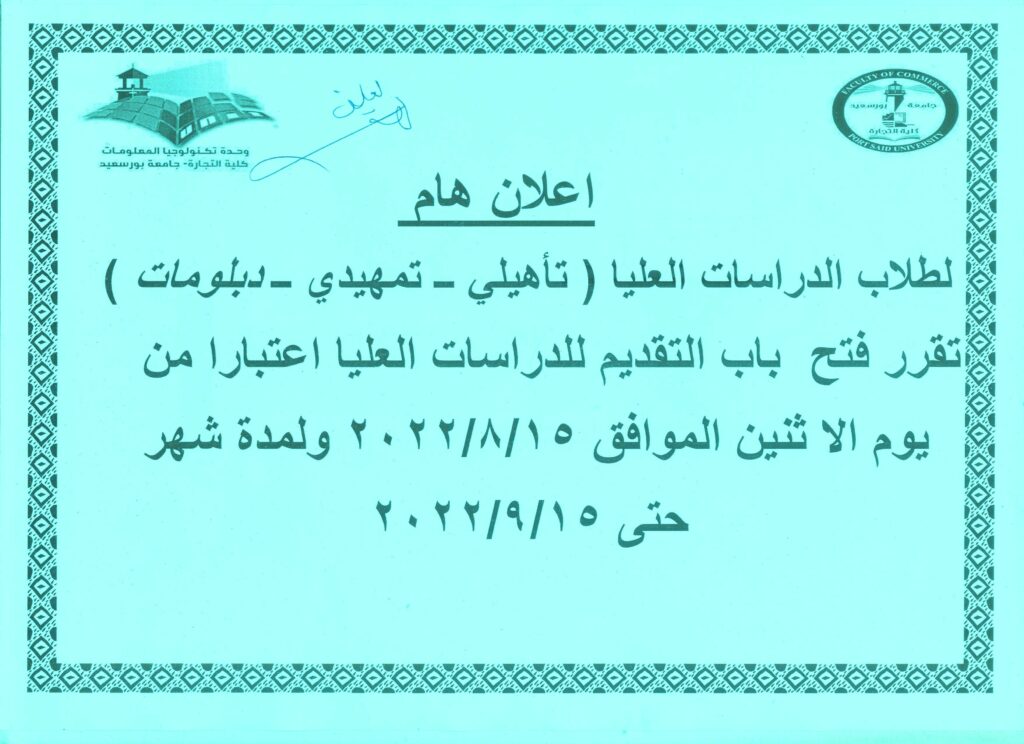 اعلان عن بدء التقديم للدراسات العليا للعام الجامعى 2022/2023