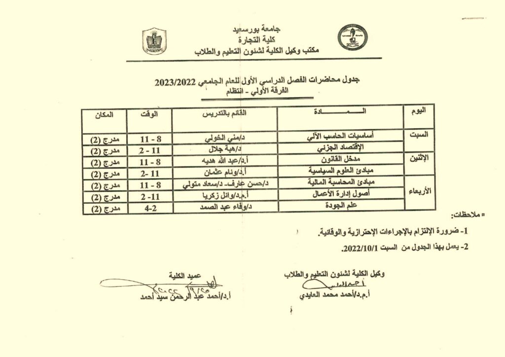 جدول محاضرات الفرقة الاولى انتظام للفصل الدراسى الاول من العام الجامعى 2022/2023بواسطة Commerce Author / سبتمبر 26, 2022